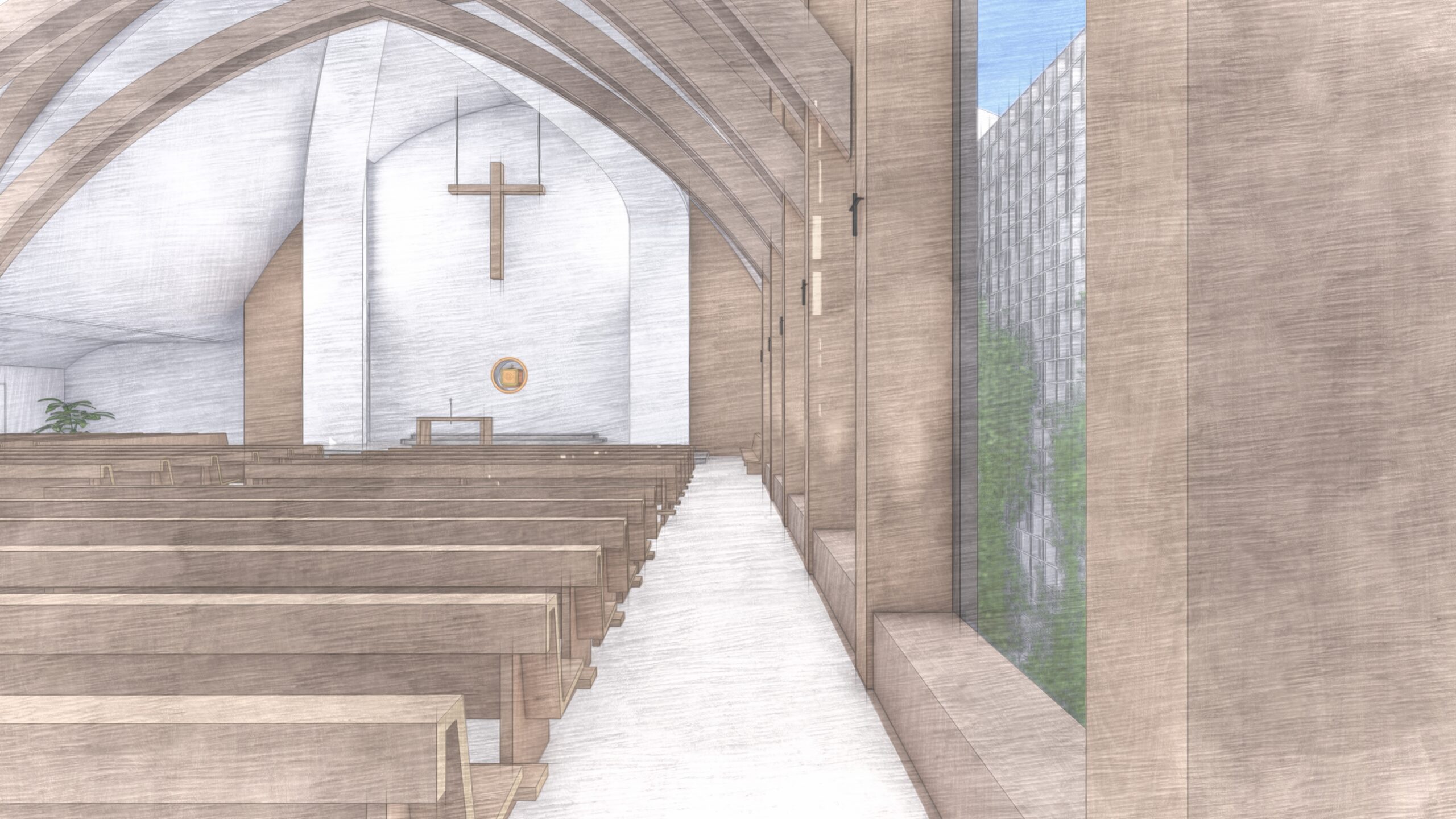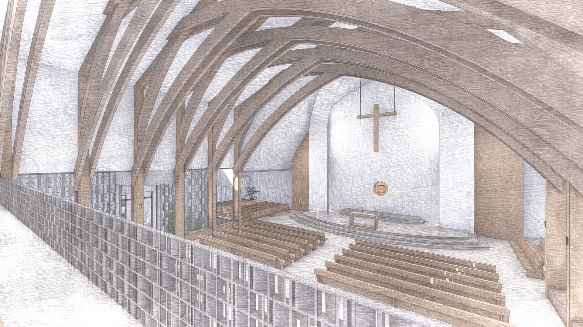El edificio está inspirado en la arquitectura eclesial europea de los siglos XII-XVI, pero con una reinterpretación contemporánea que conecta con la sensibilidad actual. Colores, materiales, proporción y forma, hacen del edificio una obra singular aunque integrada en el entorno.