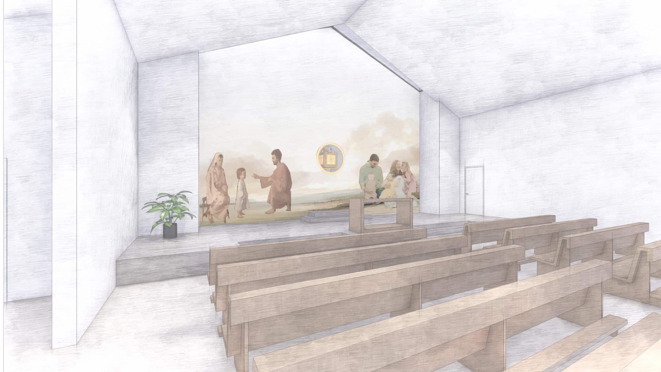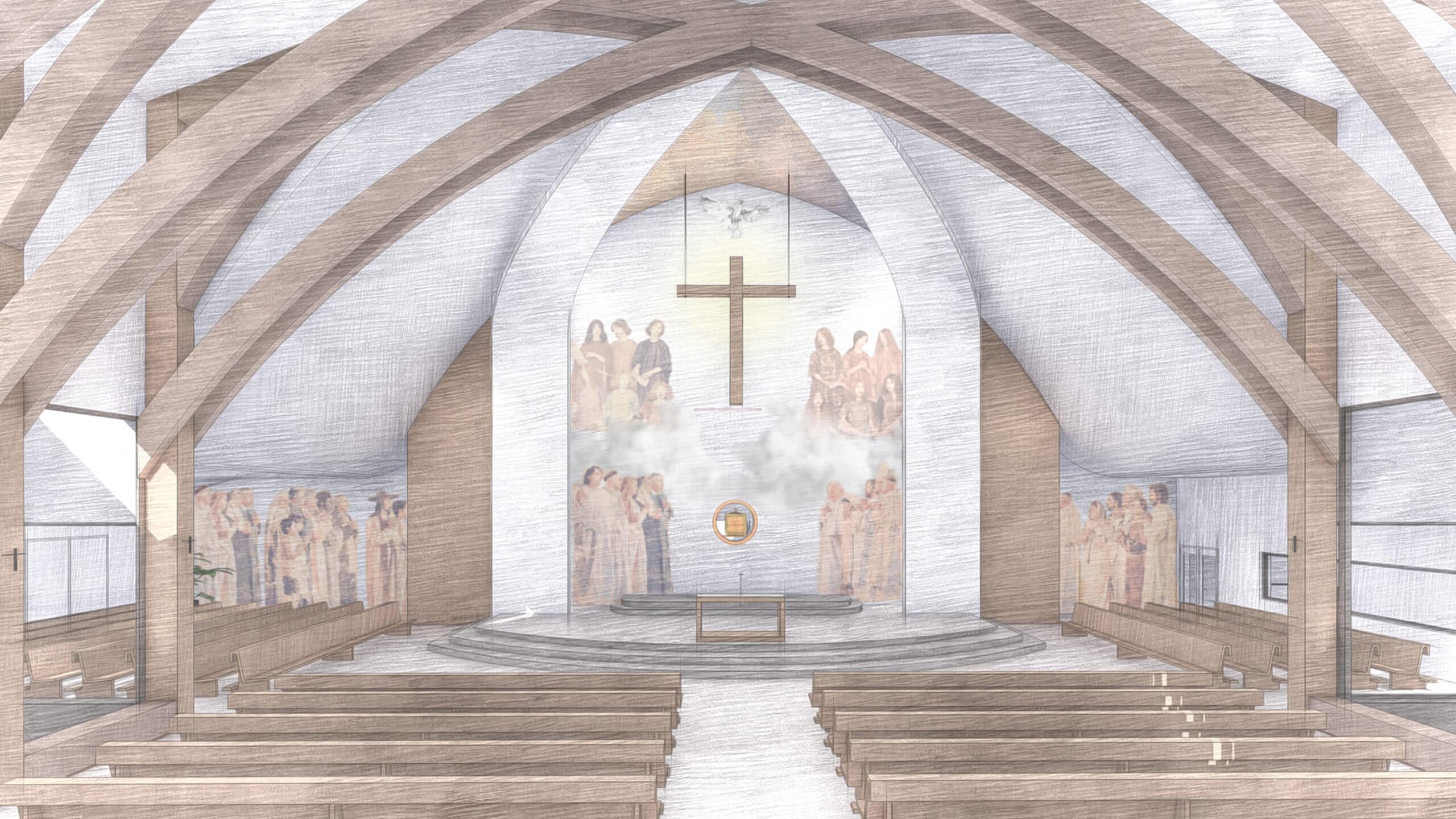 En los dibujos no se aprecia el retablo que será hecho con pintura mural, que enmarca la imagen de Cristo Crucificado, decorando todo el ábside y el presbiterio. El sagrario de la nave se comparte con la Capilla de la Sagrada Familia, situada detrás del retablo; un espacio para el recogimiento y para celebraciones más pequeñas.